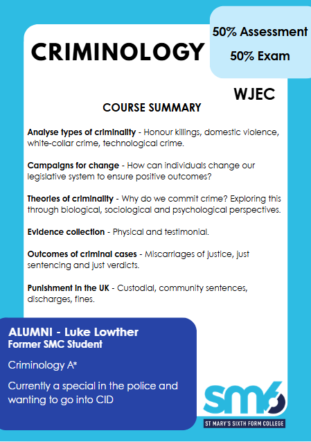 The Applied Diploma in Criminology blends elements of psychology, law, and sociology to explore crime and the criminal justice system. It consists of four units: Changing Awareness of Crime, Criminological Theories, Crime Scene to Courtroom, and Crime and Punishment. Students investigate why crimes go unreported, examine theories of criminal behaviour, understand the justice process, and evaluate methods of social control. Assessment includes two controlled assessments and two written exams. The course develops analytical, evaluative, and research skills, preparing learners for further study or careers in criminology, law, policing, or social and probation work.
